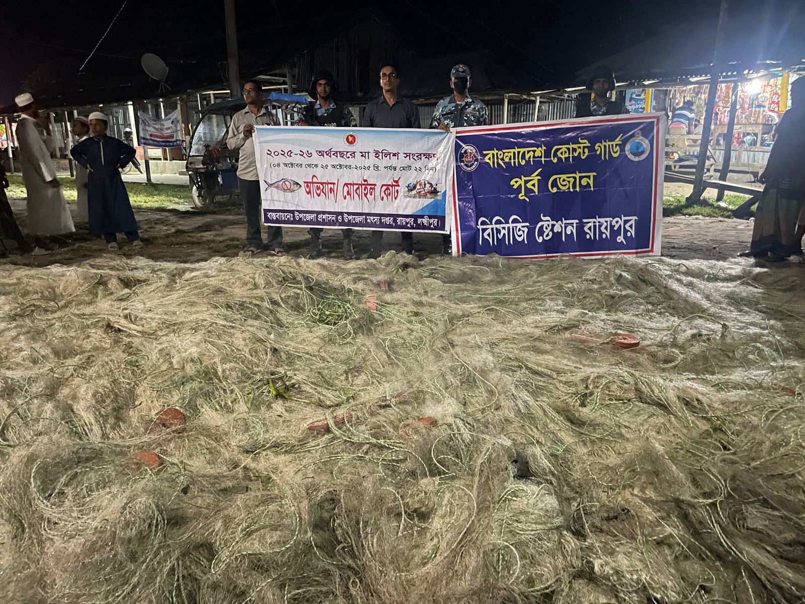 রায়পুরে মা ইলিশ সংরক্ষণ অভিযানে ৫০ হাজার মিটার জাল জব্দ